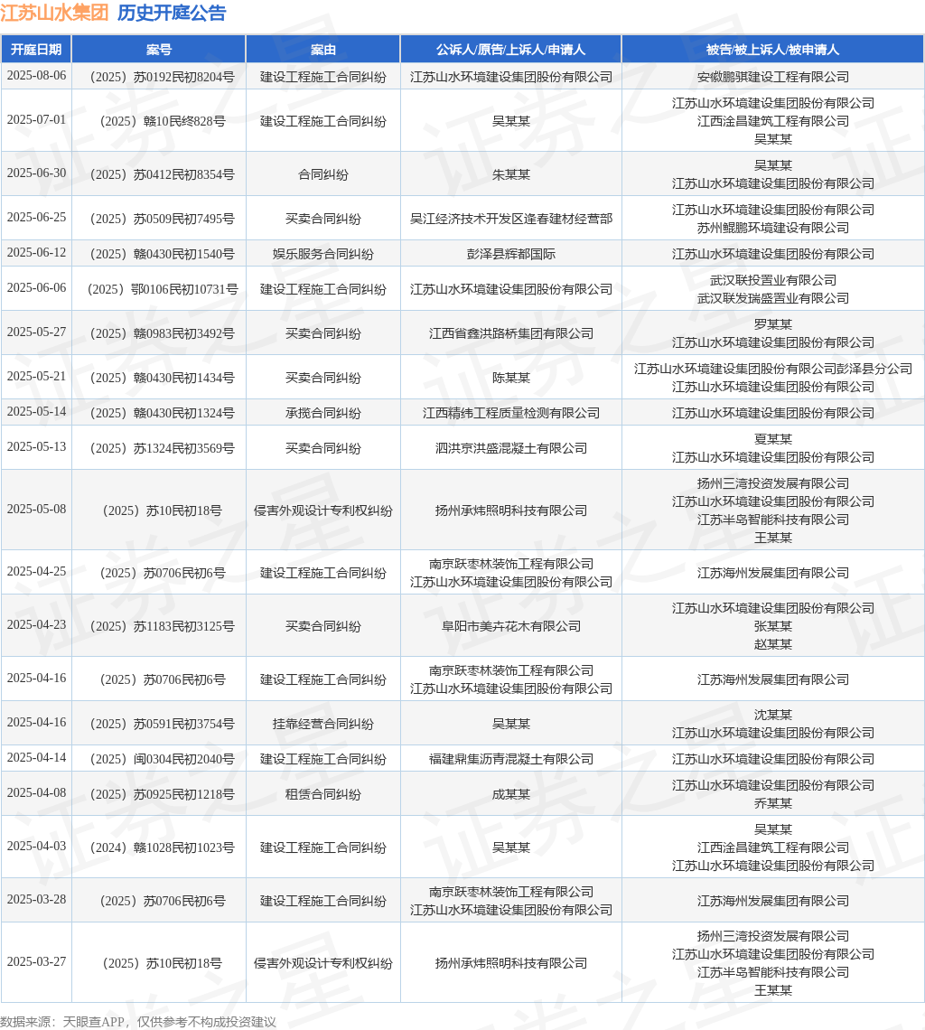 本站音问欧洲杯2024官网,把柄天眼查APP涌现,近日公布了一则江苏山水环境树立集团股份有限公司手脚被告/被上诉东说念主的开庭公告,详备骨子如下: