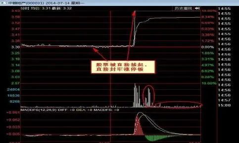 旱地拔葱直线封板是指个股的盘中走势十分坦然,涨跌幅度皆很小。随后加快上攻,上升速率十分快,股价犹如被蓦然拔起一般,只是资格了这一波上升(简略上升经过中稍有停顿),就封住了涨停板。